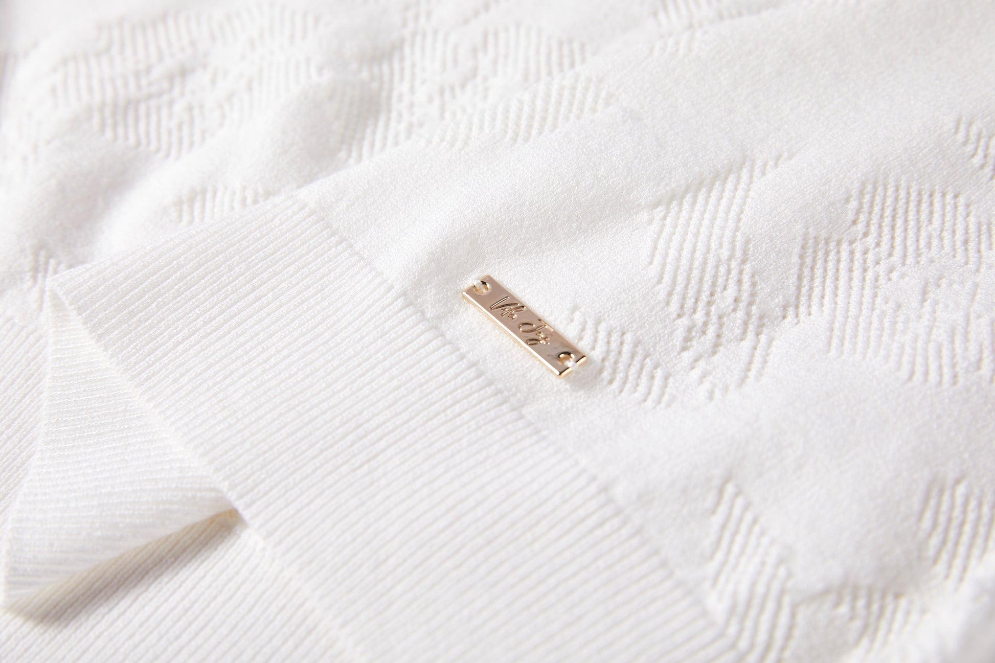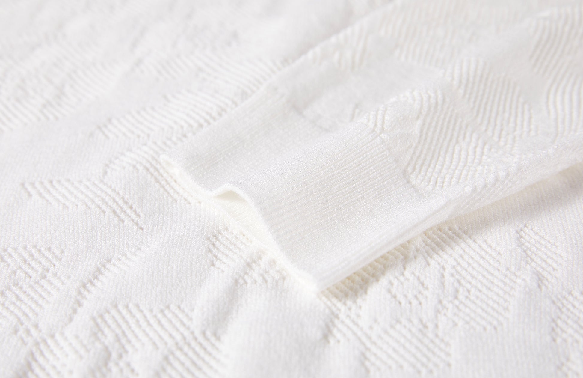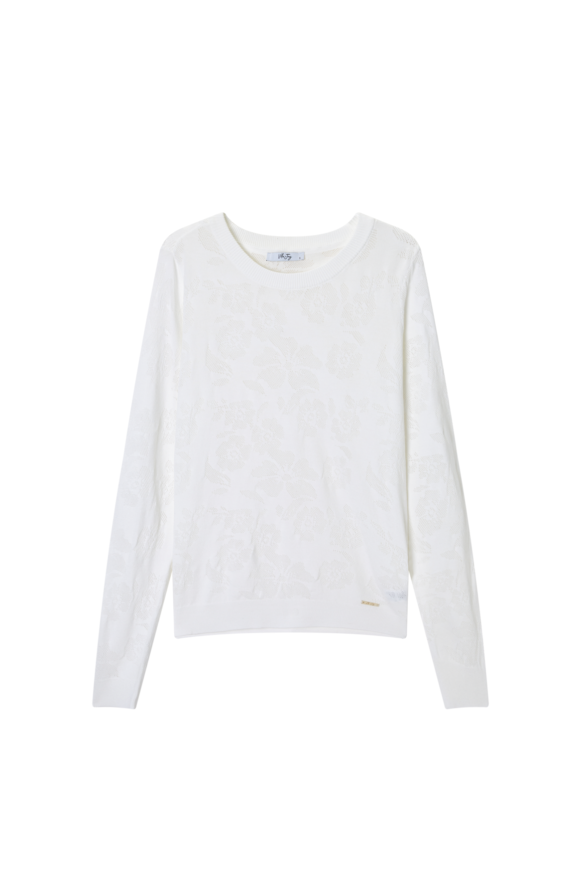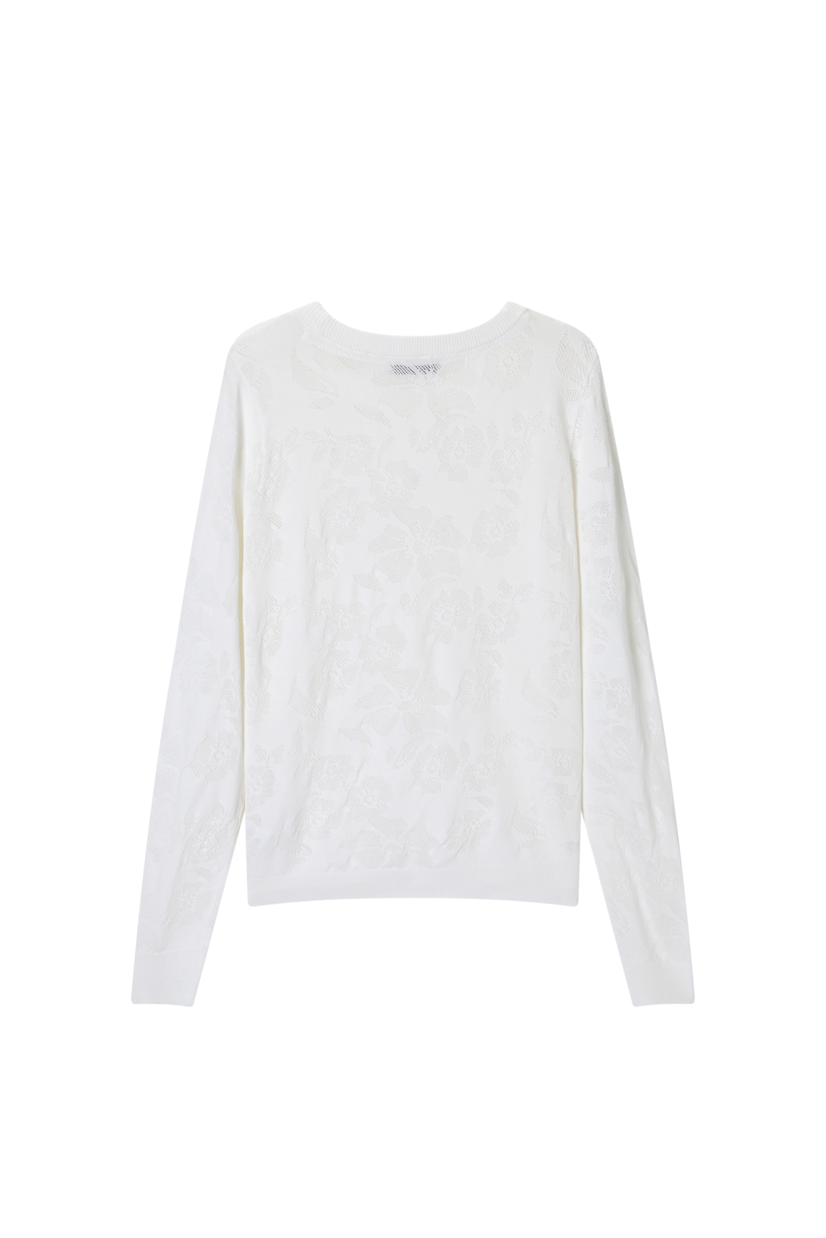 This elegant white sweater features a subtle woven floral pattern that adds a refined, soft look. The light texture creates depth without being too bold. A versatile piece that pairs beautifully with both casual and dressed-up outfits.
