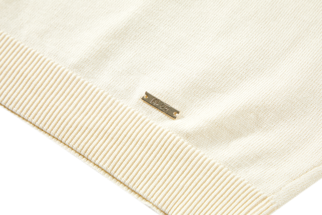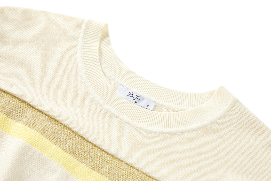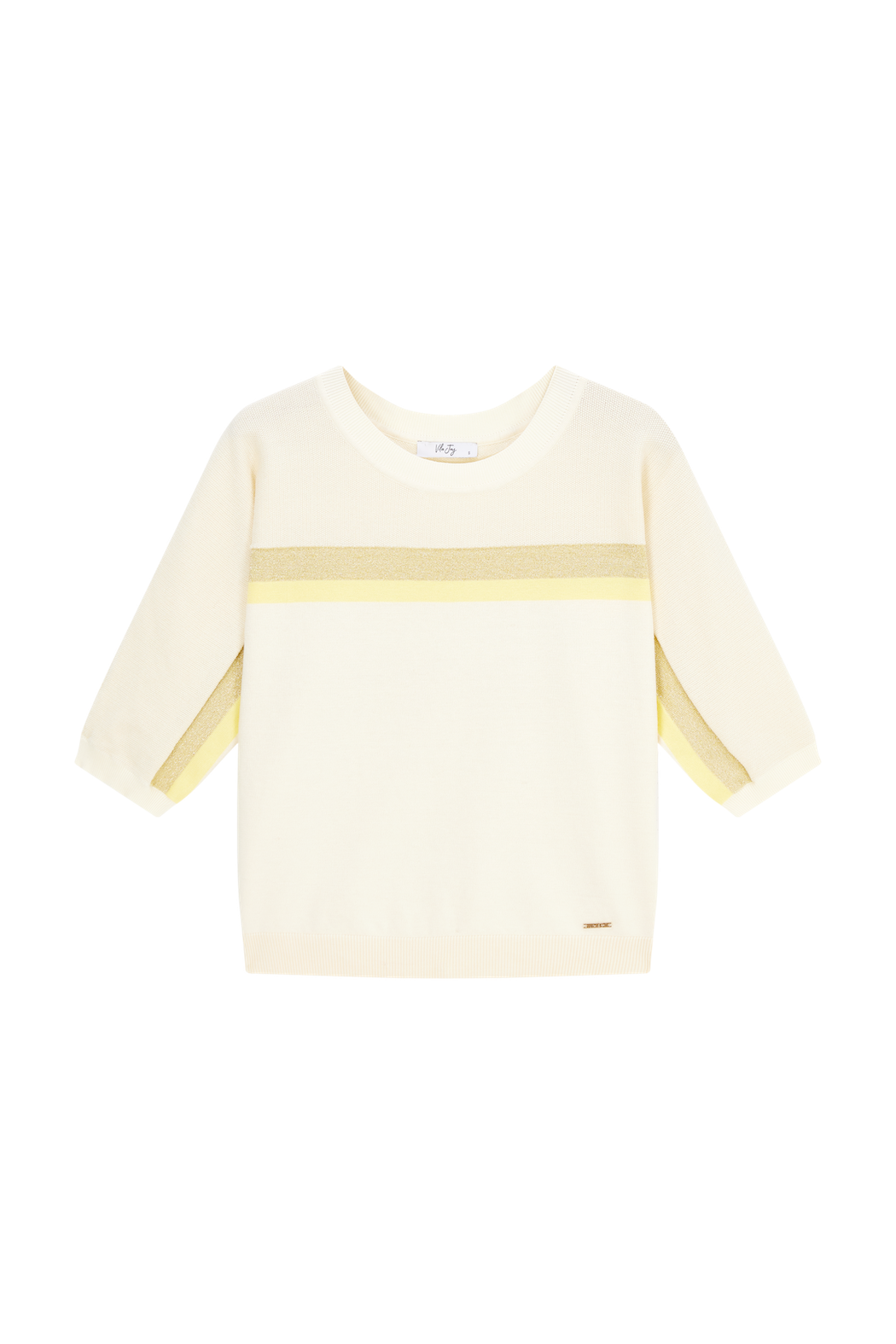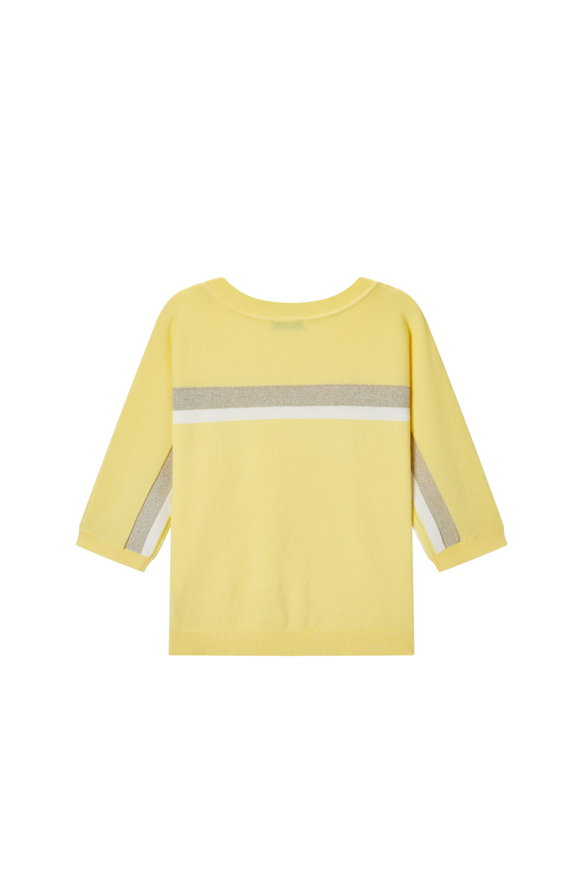 This sweater features a soft cream base with fresh yellow and golden stripes for a subtle, cheerful look. The 3/4 sleeves add an airy and modern touch. Perfect for bright, sunny days.