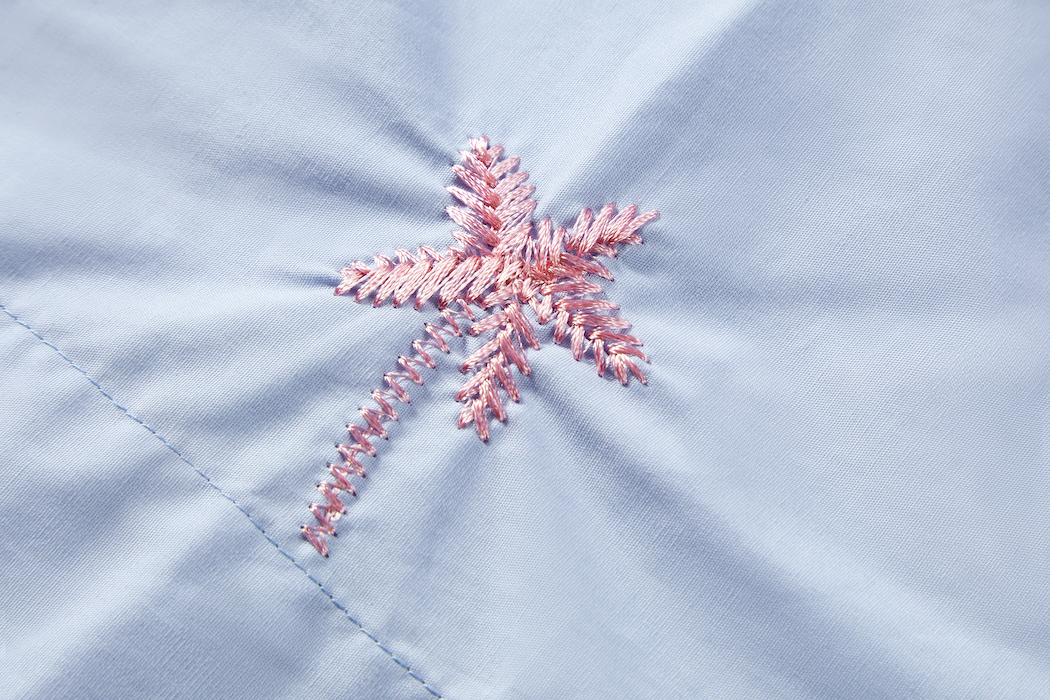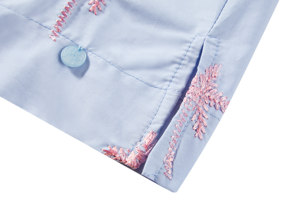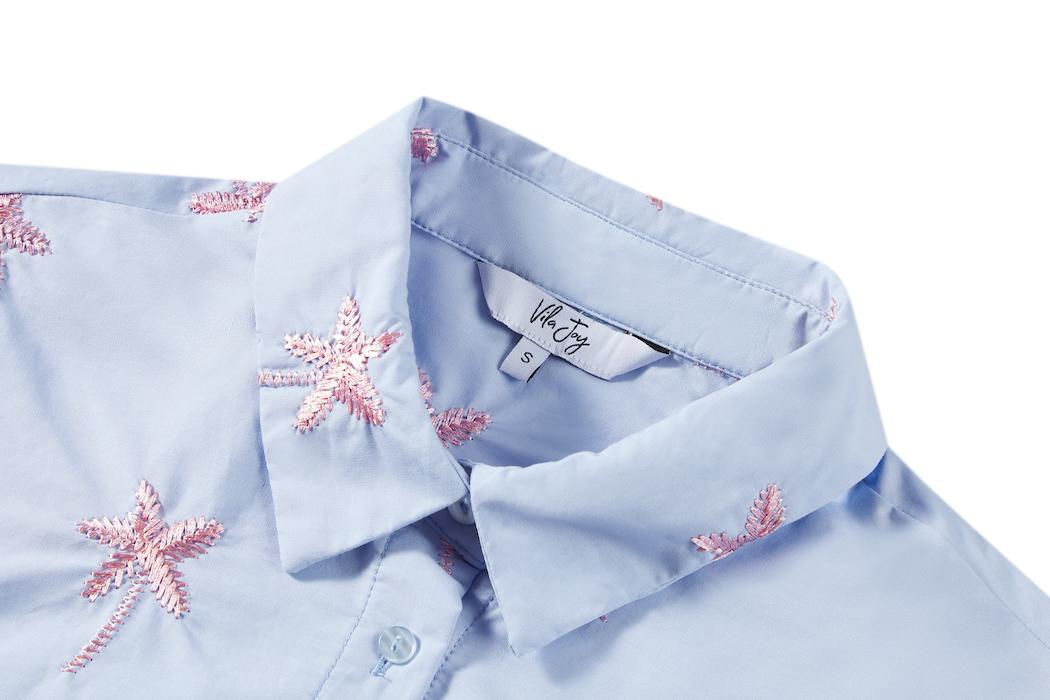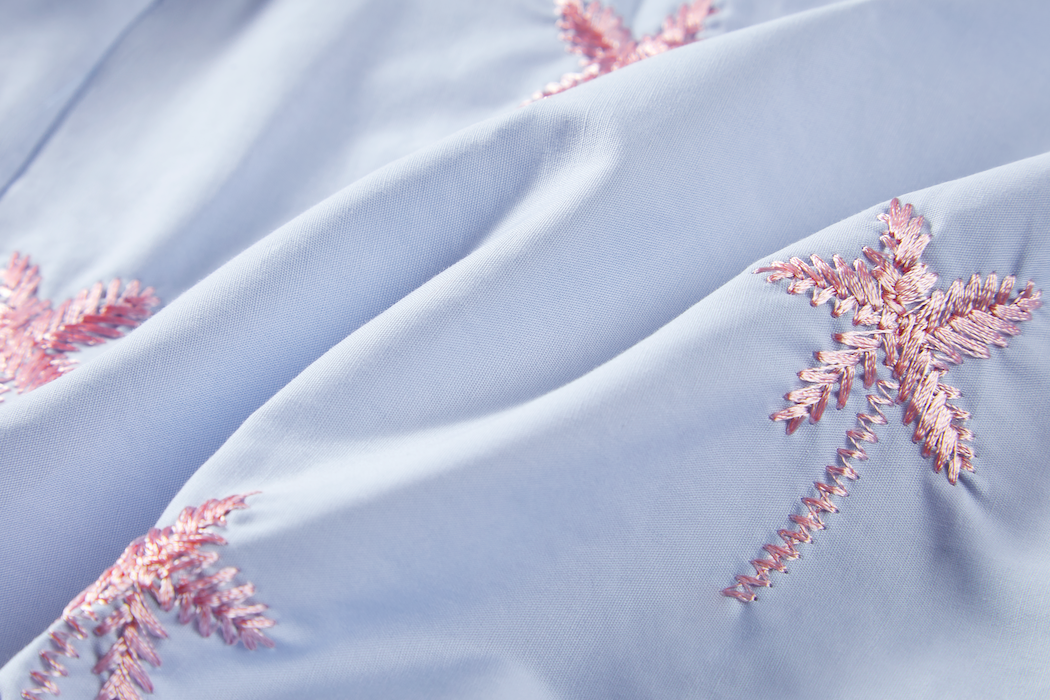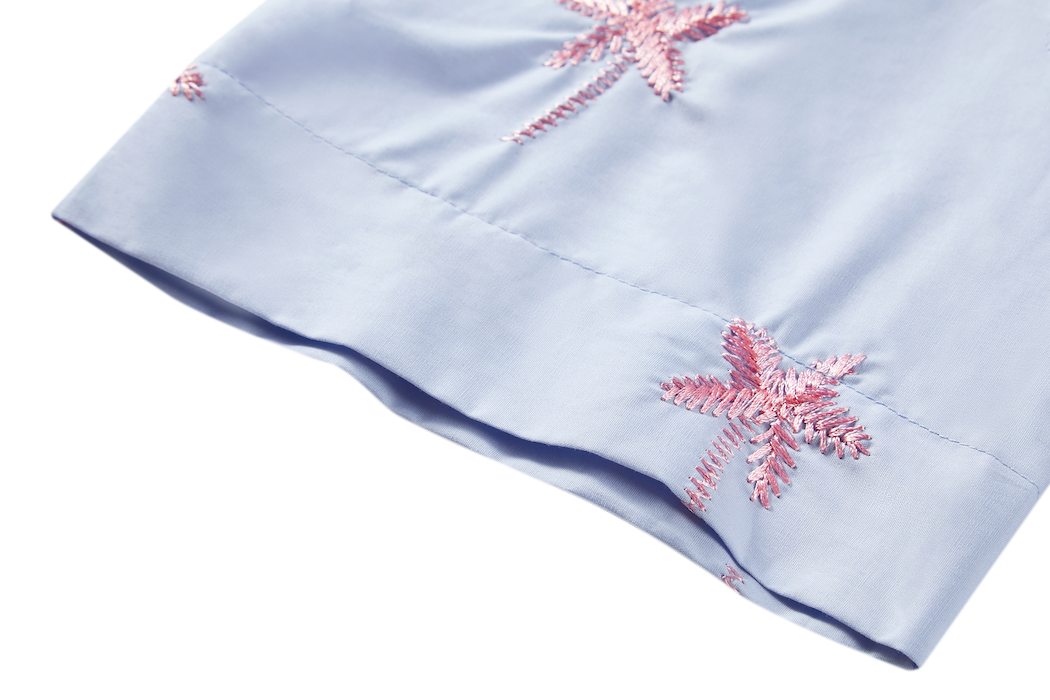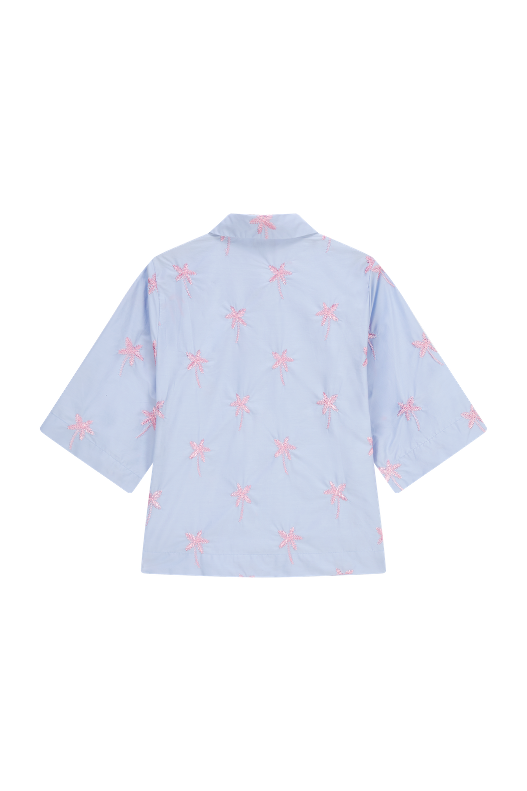 This light blue blouse is decorated with pink palm-tree embroidery for a playful, summery look. The relaxed fit and half-length sleeves create an airy and comfortable feel. Perfect for adding a cheerful touch to any outfit.