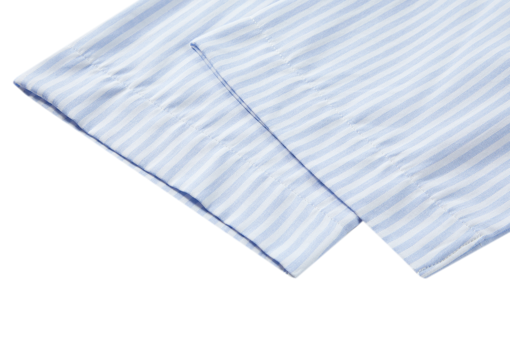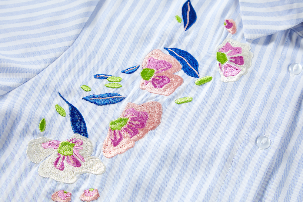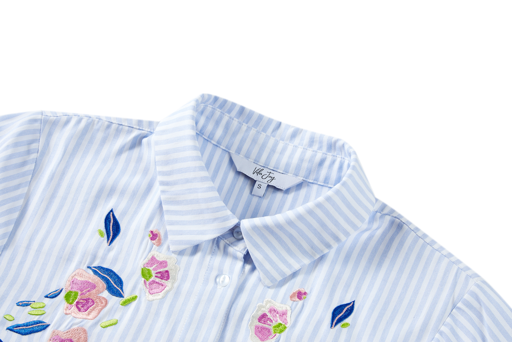 This light blue striped blouse features a loose, modern fit with wide 3/4 sleeves. The colorful floral embroidery on the chest adds a fresh and romantic touch. A perfect piece to give any outfit a summery feel.