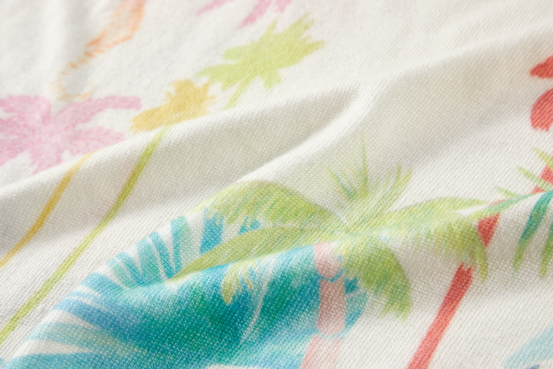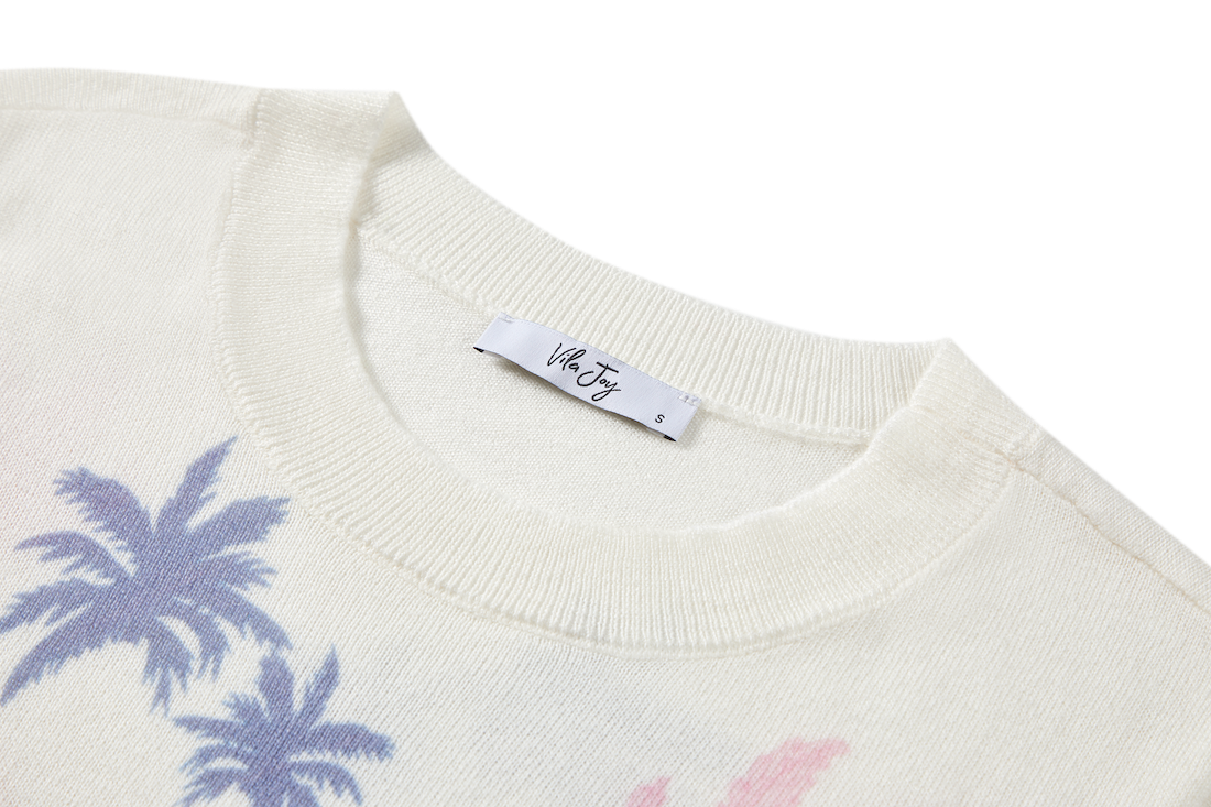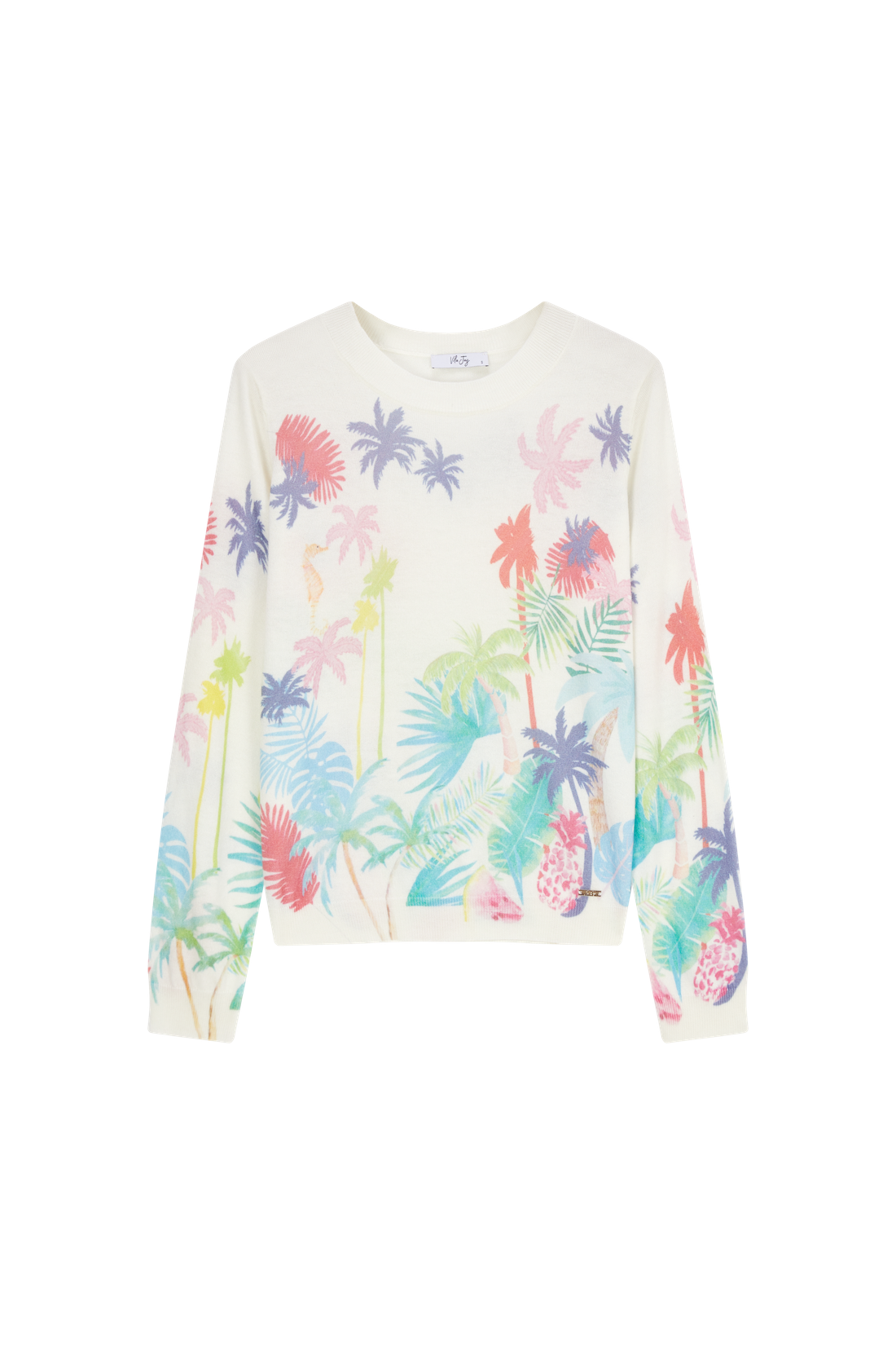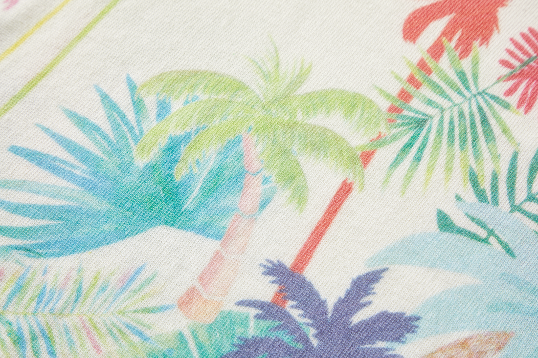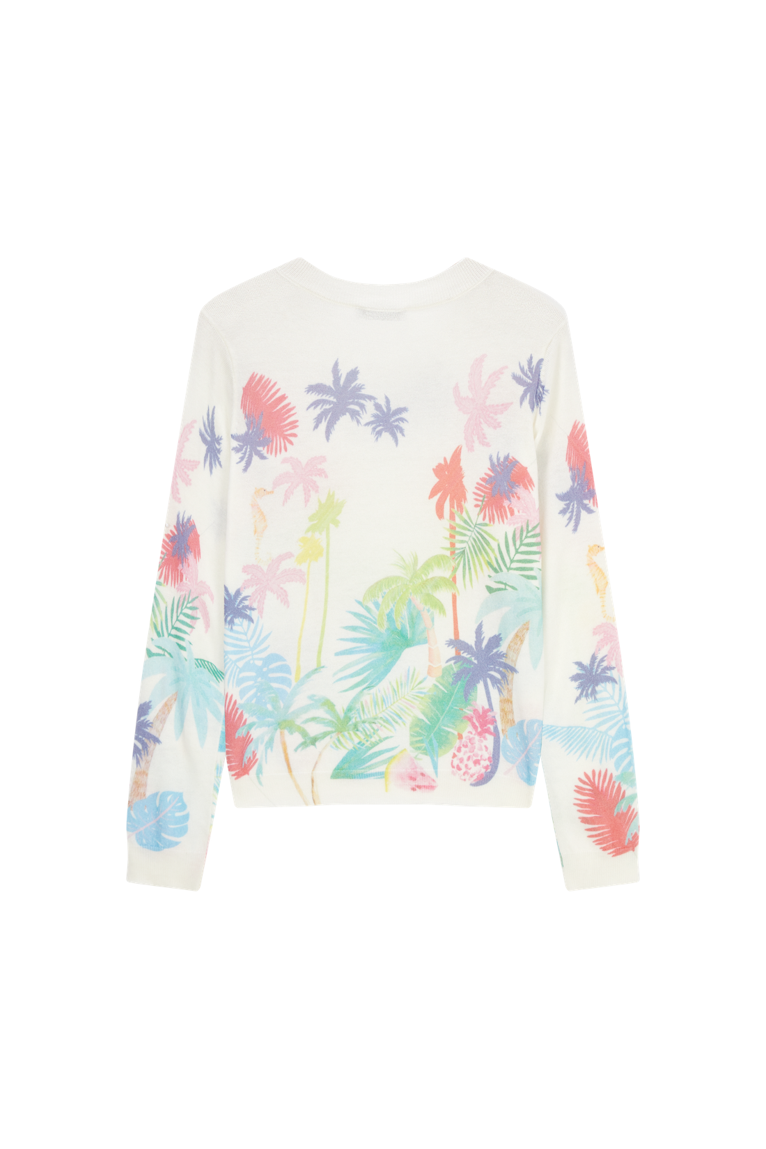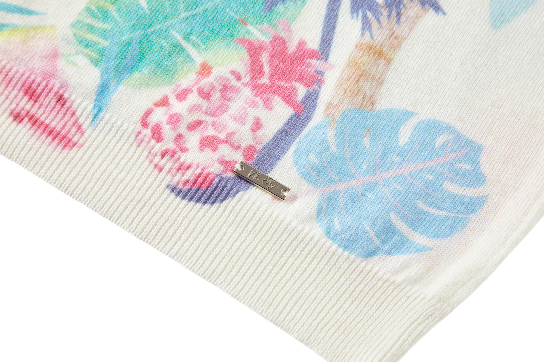 This sweater features a soft white base with a colourful tropical print full of palm trees and leaves. The blend of pastel shades creates a light and cheerful look. A perfect piece to give any outfit an instant summer vibe.