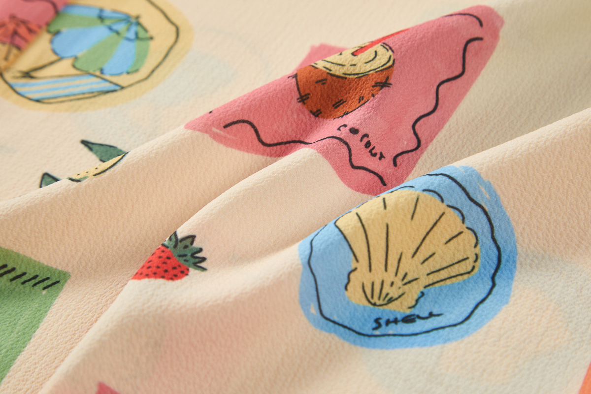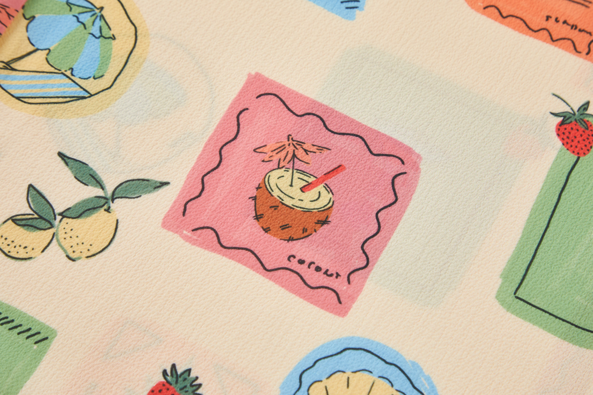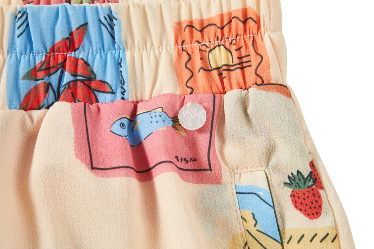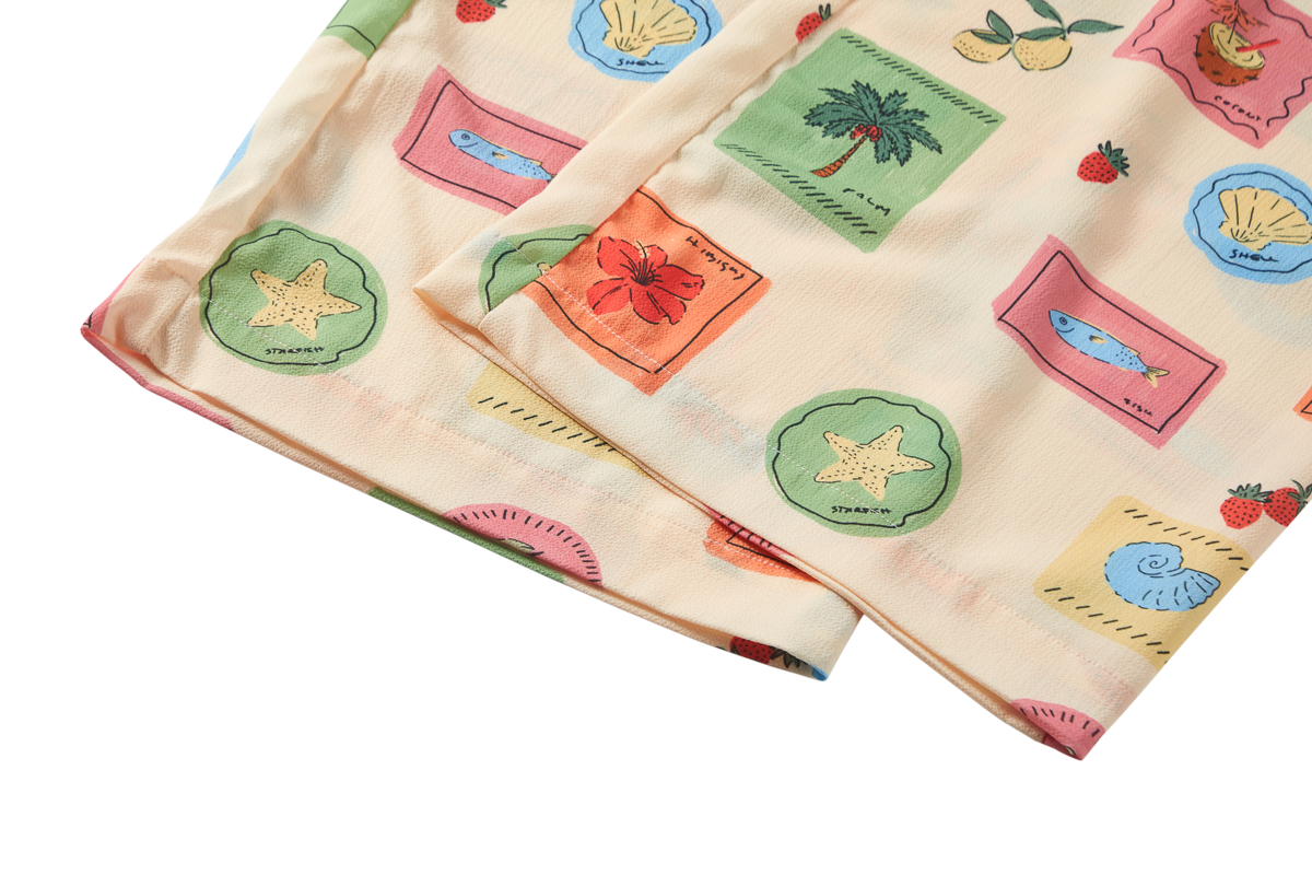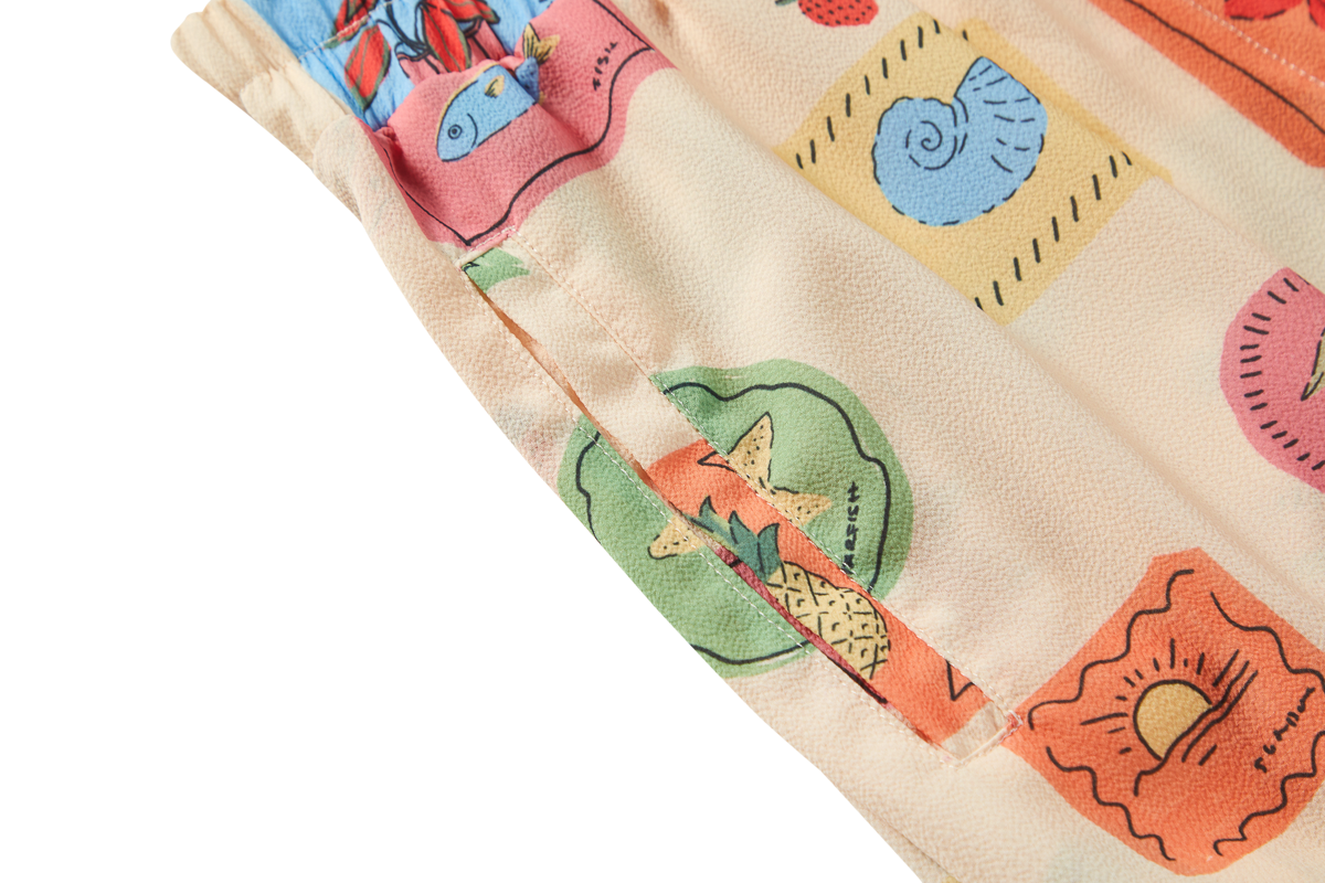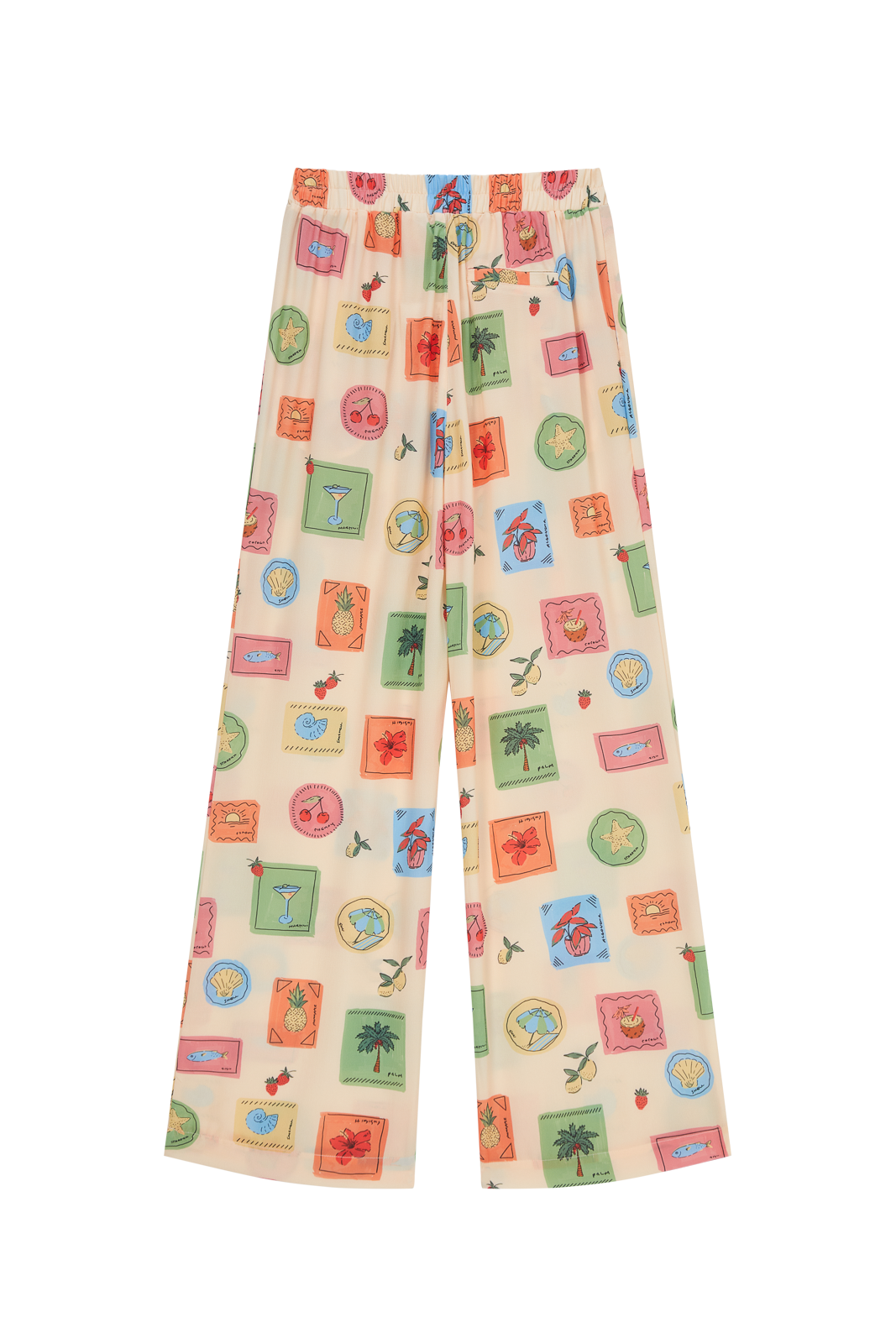 These trousers feature a cheerful print with colorful illustrations that instantly give off a summery vibe. The wide-leg fit creates a relaxed and airy look. Perfect for adding a playful and eye-catching touch to any outfit.